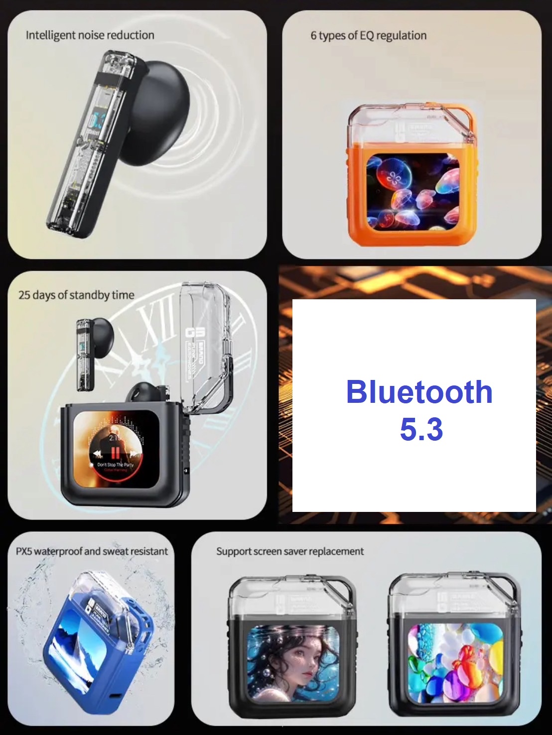 ✅ บลูทูธ 5.3 กินพลังงานน้อย เชื่อมต่อรวดเร็ว เสถียร ✅ ตัวกล่องชาร์จมีหน้าจอ LCD Touch screen ความคุมการทำงานหูฟังได้ ✅ สามารถควบคุมการเล่น-หยุดเพลง เพิ่ม-ลดเสียงได้ที่กล่องหูฟัง ✅ มาพร้อม Equalizer ปรับได้ที่กล่องหูฟัง ✅ แสดง % แบตเตอรี่กล่องชาร์จและหูฟังผ่านหน้าจอ LCD ✅ เปลี่ยนหน้าจอ Wallpaper ที่กล่องได้ ✅ มีไมค์ 4 ตัว (ข้างละ 2 ตัว) คุยโทรศัพท์ชัดเจน มาพร้อมระบบลดเสียงรบกวนในขณะคุยโทรศัพท์ (Environmental Noise Cancelling หรือ ENC) ✅ เสียงดี เบสหนัก ✅ ฟังเพลงต่อเนื่อง 8-10 ชม แสตนบายด์ 200 ชม ✅ เรียก Siri หรือ google assistant ได้ ✅ กันน้ำ IPX5